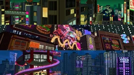 The Benten district in the Jet Set Radio series so far, has been set during the time of night. The district is more focused on entertainment compared to Shibuya and Kogane, as shops and entertainment zones have a heavy presence in the area. Compared to both districts, citizens are also present throughout, possibly a bit more crowded than in Shibuya. Things such as vehicles and residential areas are usually relegated to one location and are much lesser compared to Shibuya and Kogane.
