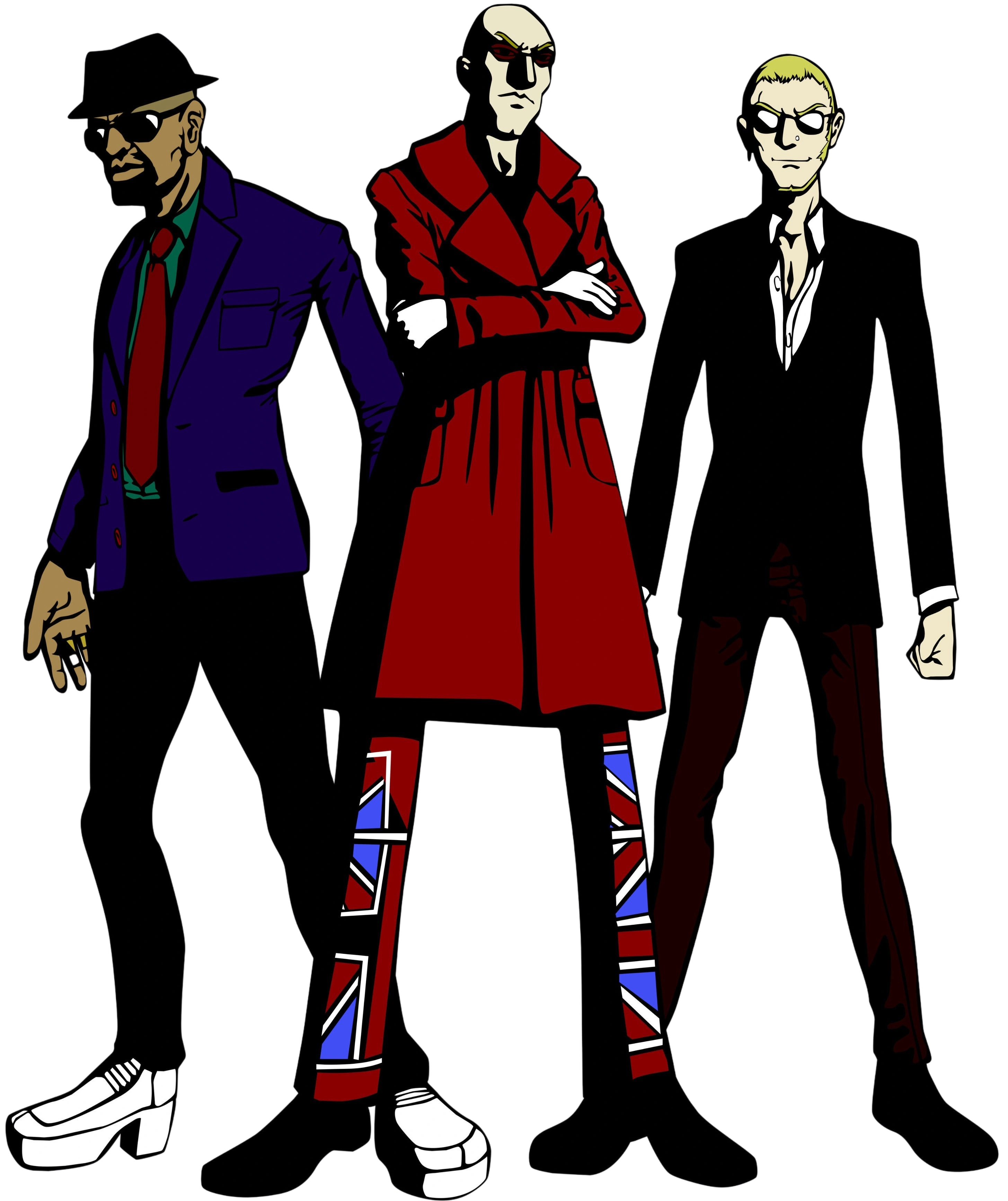 All three team members wear black sunglasses. The lead Boss of Team UK's attire consists of wearing a red coat and red pants that features the design of the Union Jack, and he wears black shoes. Unlike his teammates, no hair is visible on him. The first Sub-Boss of Team UK's outfit consists of an unbuttoned blue shirt jacket with a green shirt underneath along with a red tie. He wears two rings on his right hand and one on his left, and white shoes with heels. He sports a fedora and has black facial hair. The second Sub-Boss of Team UK's attire consists of him wearing a black shirt with an white underneath that is unbuttoned at the top, red pants, and black shoes. His hair and facial hair are blond.