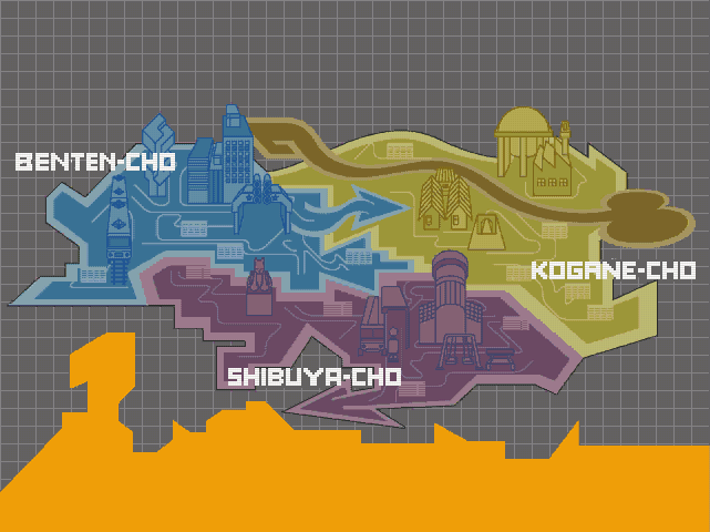 Tokyo-to is very reminiscent of a 1990s version of the real Tokyo. In the intro cutscene, DJ Professor K says it is located "somewhere in Asia" and that it "cannot be found on any map". He also mentions that everyone just calls the city Tokyo. The city is split up into three districts: Shibuya-cho, Benten-cho, and Kogane-cho, each of which corresponds to a different time of day. Shibuya-cho is always seen by day, whilst Benten-cho is set at night, and Kogane-cho is at sunset. These districts are home to various gangs of Rudies, each with their own territory. Those gangs include: the GG's, the Love Shockers, Poison Jam, and the Noise Tanks. The city also holds home to the radio station, "Jet Set Radio".